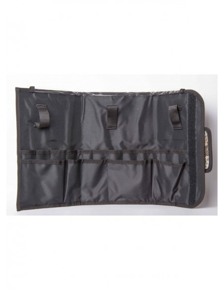 MANTA PROFISSIONAL COM PELE DE COBRA E COURO SINTÉTICO PRETO INTERNO. TEM 12 PEQUENOS E 4 GRANDES BOLSOS, CINTO E PROTETOR PLÁSTICO DENTRO. INCLUI NOSSO LOGOTIPO EM METAL. FEITO A MÃO