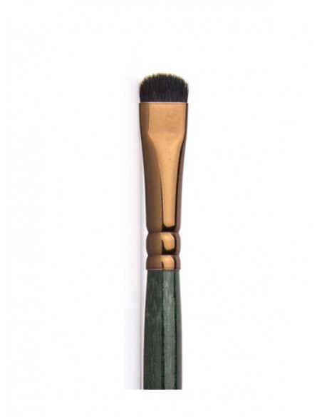 Pincel de sombras que al tener la salida del pelo corto da mejores resultados en el depósito y difuminación de sombras. Ideal para escuelas y para gente que está empezando. Es más barato y de menor calidad que el pelo de marta.