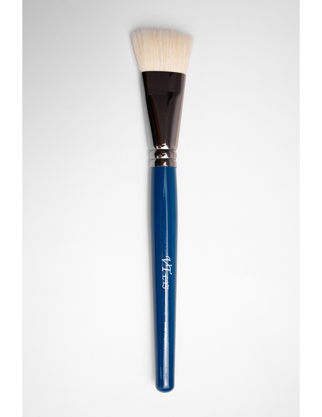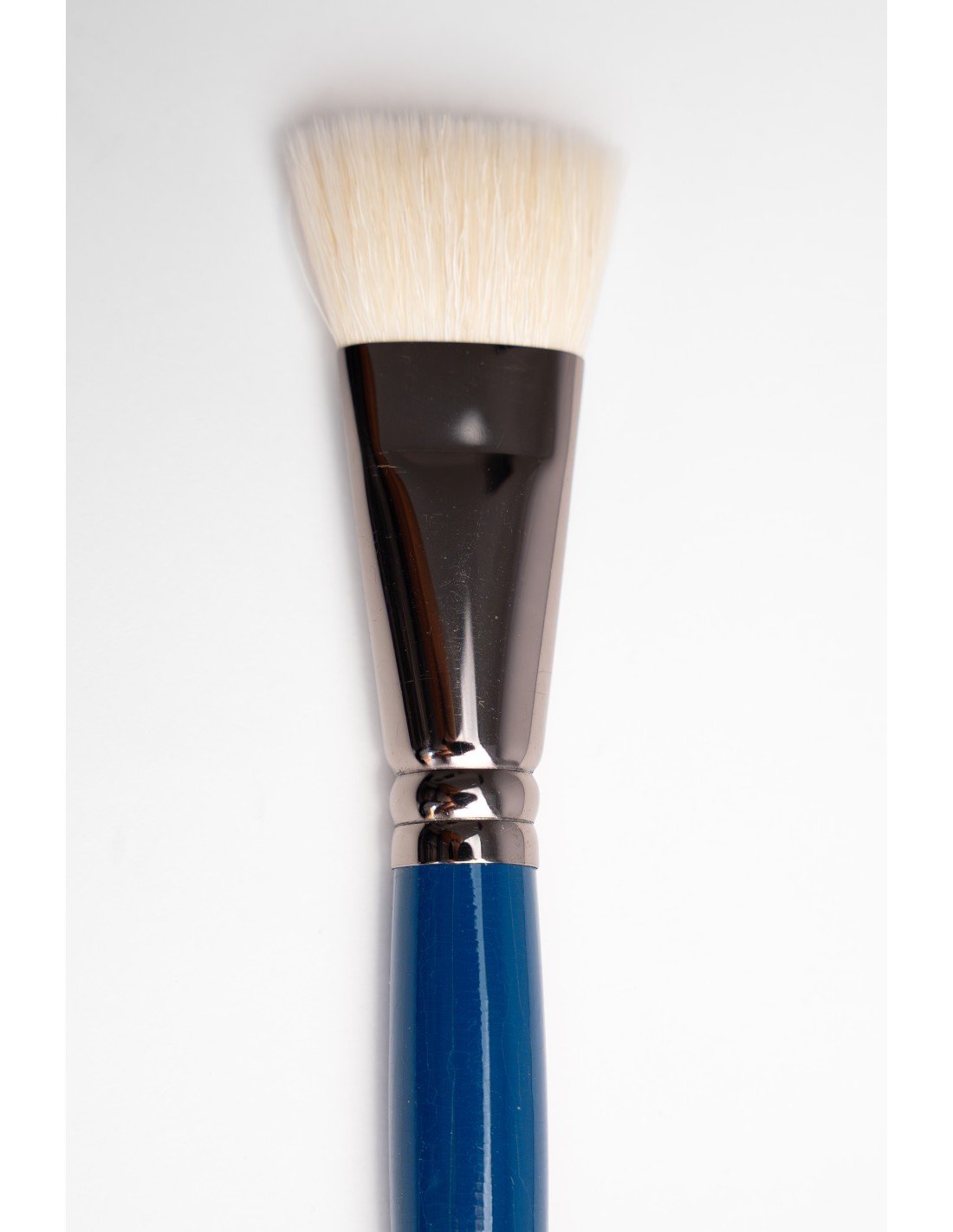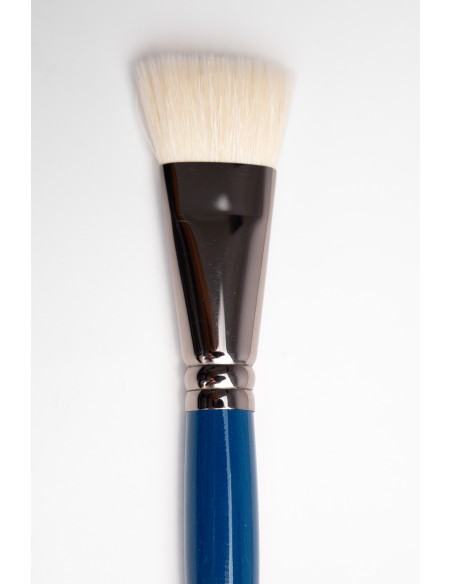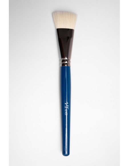 BROCHA RETA PLANA DE CABELO DE CABRA BRANCA PARA CONTORNO, CABO AZUL E VIROLA COLOR ANTRACITO. LOGO TAMPOGRAFIADA E REFERÊNCIA AO FINAL DO CABO