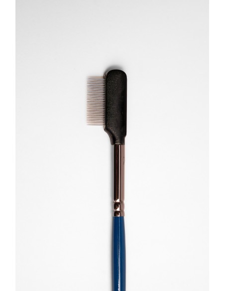 PINCEL PENTE METALICO PARA O CUIDADO DE SOBRANCENHAS, CABO AZUL E VIROLA COLOR ANTRACITO. LOGO TAMPOGRAFIADA E REFERÊNCIA AO FINAL DO CABO